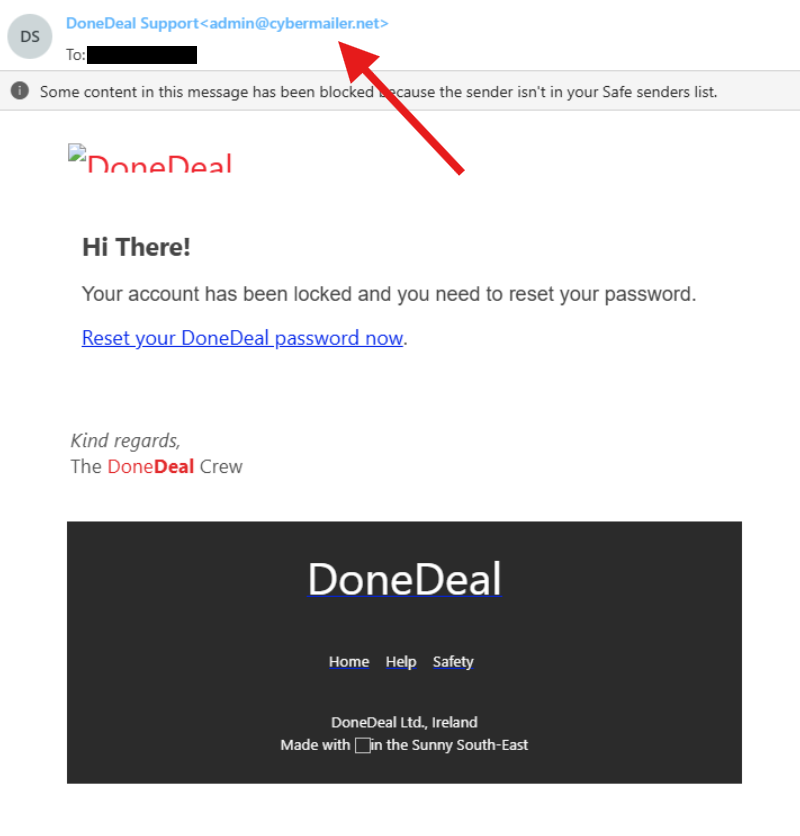 For example, consider the phishing attempt below shared with us by a DoneDeale user. At first glance, the email’s display name appears authentic and trustworthy, giving the impression that it genuinely originates from DoneDeal. However, a more detailed examination reveals that the sender's email address has no connection to DoneDeal whatsoever. This discrepancy is a critical warning sign that the email is fraudulent. Furthermore, the email contains a "password reset" link, which, if clicked, will likely direct you to a counterfeit website designed to look exactly like DoneDeal’s official site. Any information you enter on this fake site, such as your login credentials or personal details, will be captured by the attackers and used for malicious purposes.